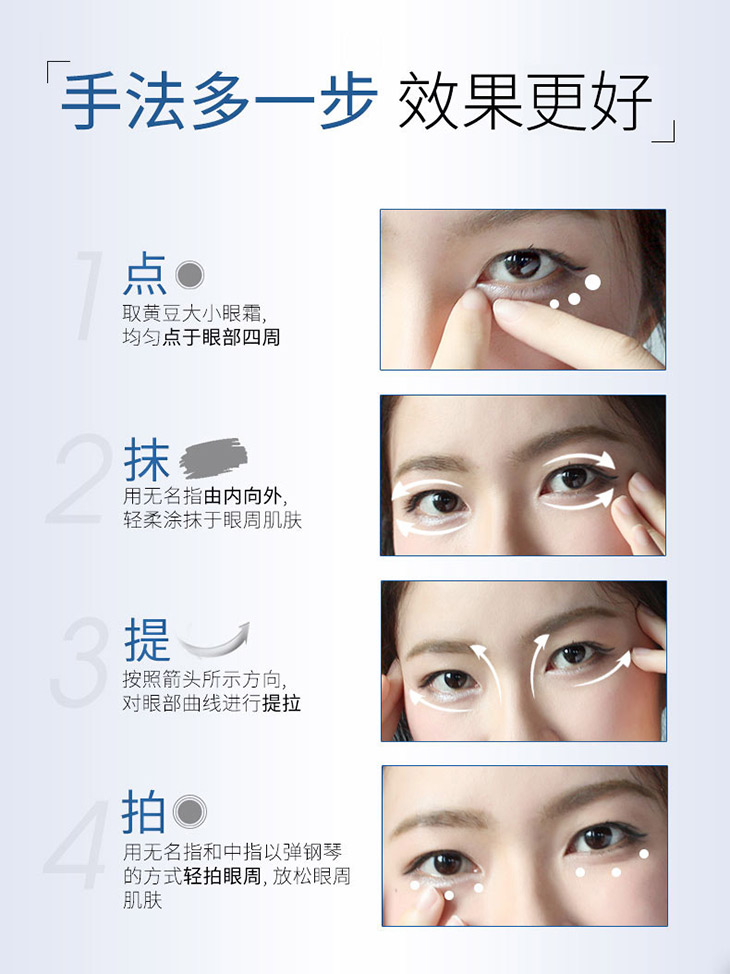 【產品功效】:促進眼周淋巴循環,具有撫平眼部細紋、消除眼袋、祛除黑眼圈、消腫和柔軟肌膚的作用,舒緩雙眼的緊繃和不適感,用后眼部肌膚倍感舒爽緊致。